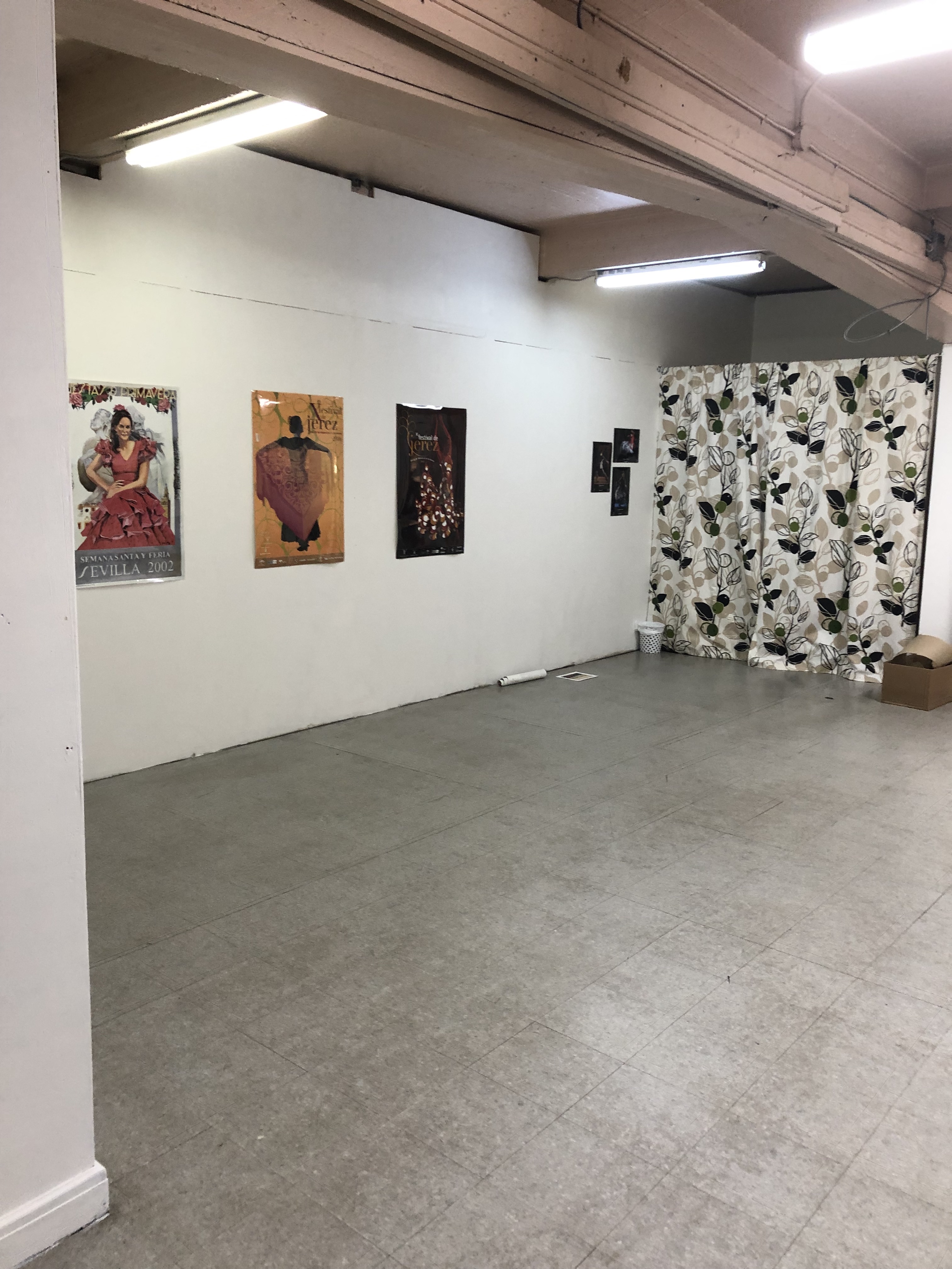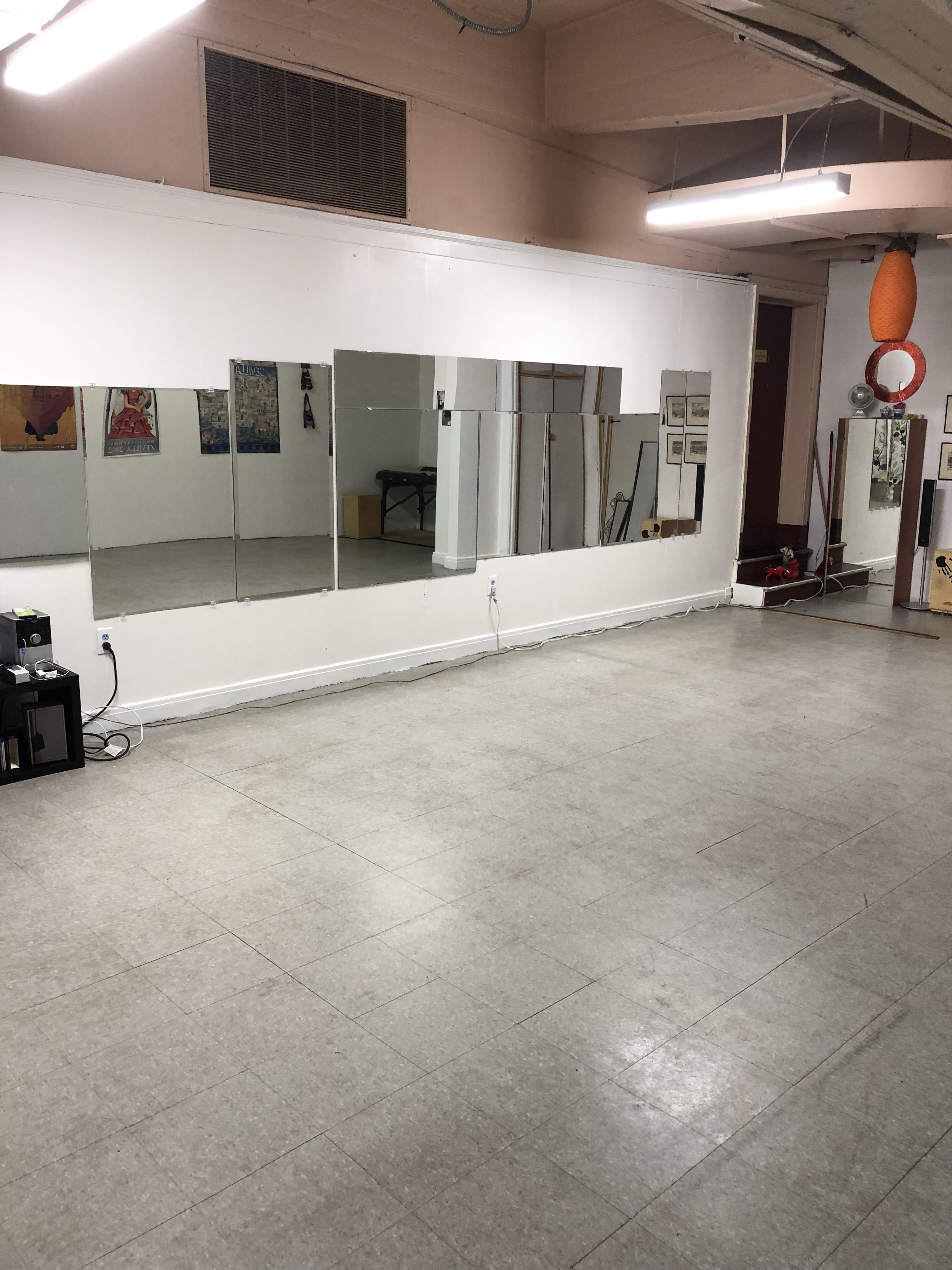A converted stage, the studio is a bit eclectic at the moment. The studio has mirrors, a stereo and a small change room. I am constantly working on updating the studio and improving the space to make it our home.